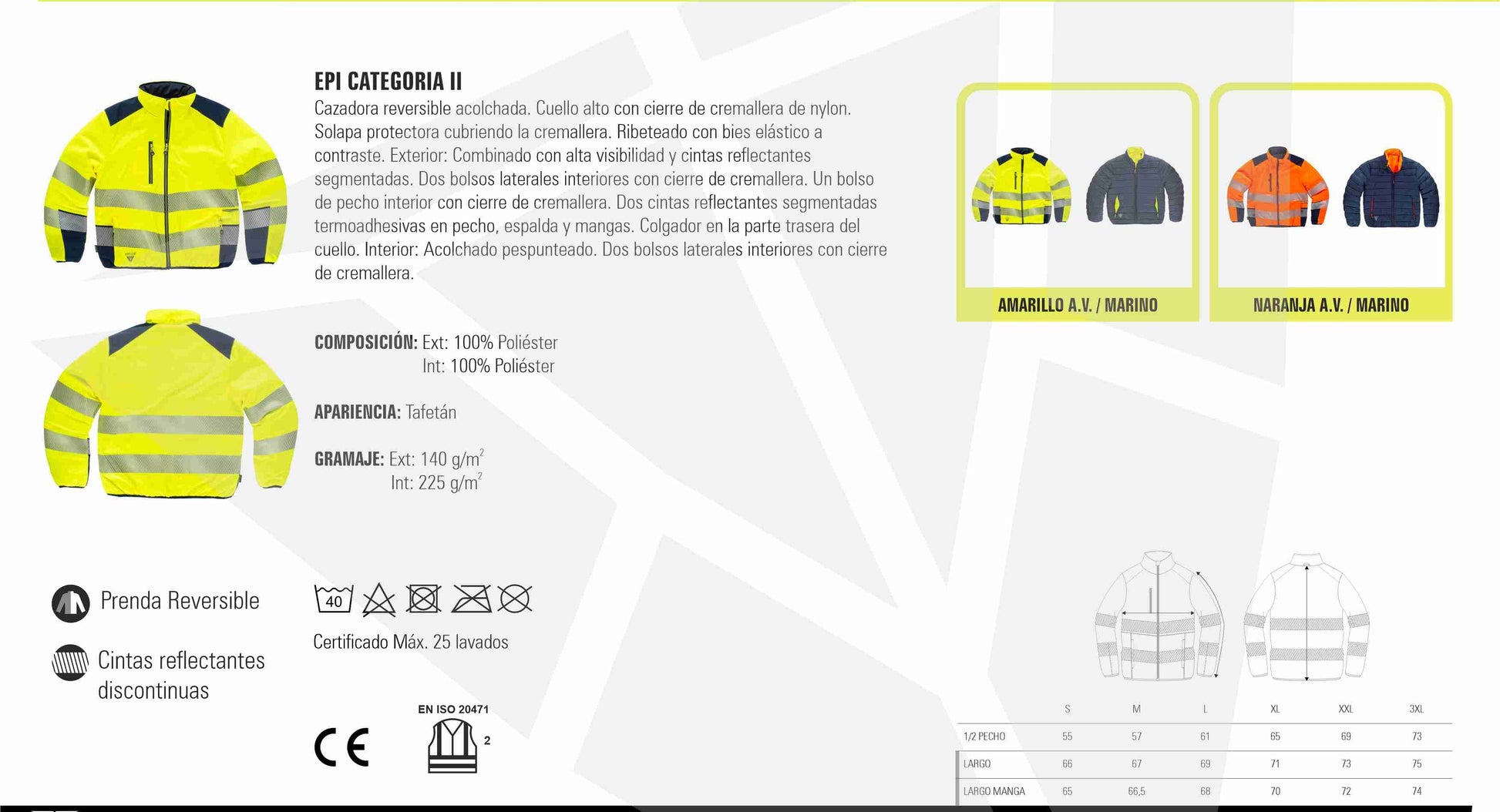 Cazadora reversible acolchada. Cuello alto con cierre de cremallera de nylon. Solapa protectora cubriendo la cremallera. Ribeteado con bies elástico a contraste. Exterior: Combinado con alta visibilidad y cintas reflectantes segmentadas. Un bolso de pecho interior con cierre de cremallera. Dos bolsos laterales interiores con cierre de cremallera. Dos cintas reflectantes segmentadas termoadhesivas en pecho, espalda y mangas. Colgador en la parte trasera del cuello. Interior: Acolchado pespunteado. Dos bolsos laterales interiores con cierre de cremallera.